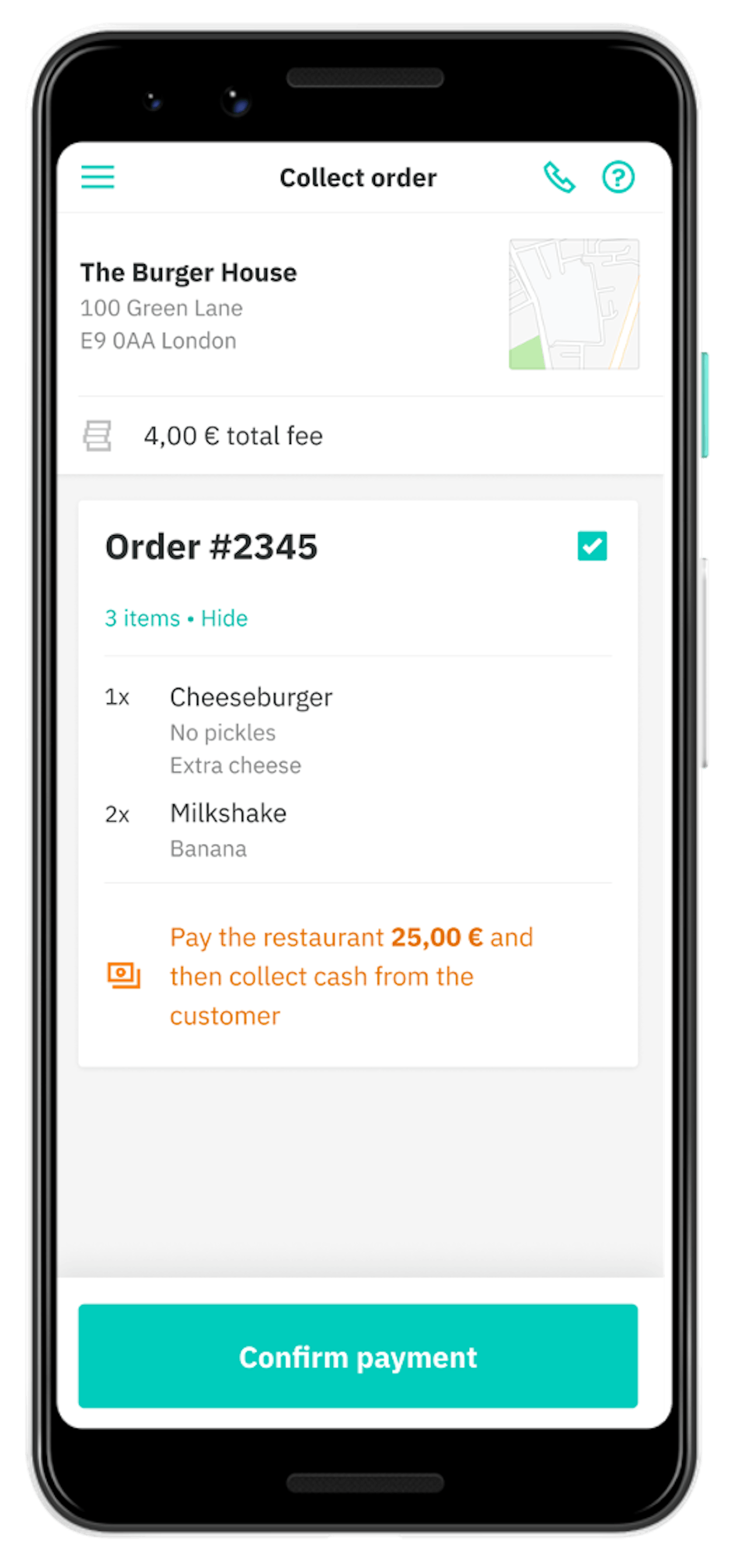 During this kind of delivery you should pay the restaurant in advance on behalf of the customer when you pick the order up and then collect the cash from the customer once you deliver the order.