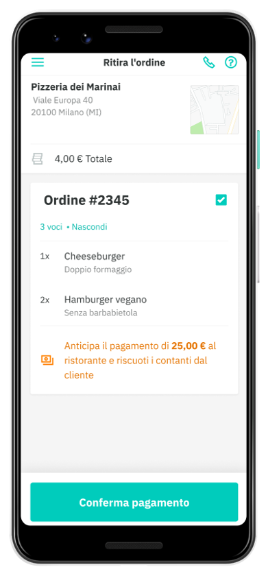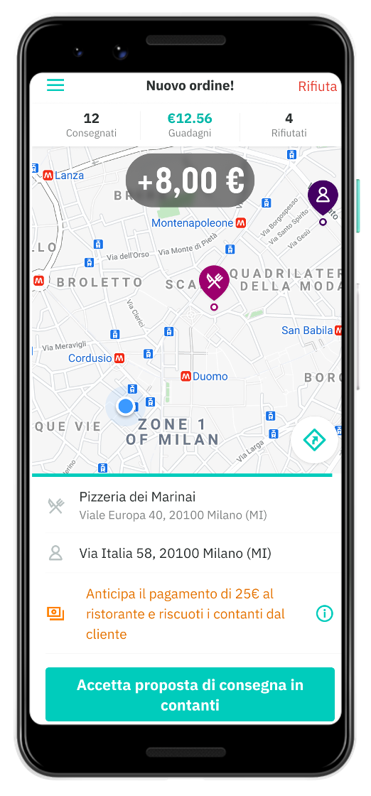 Di conseguenza, a volte potrebbe capitare di ricevere delle proposte di consegna in cui gli ordini sono pagati in contanti dai clienti e il pagamento è anticipato dal Rider al ristorante.