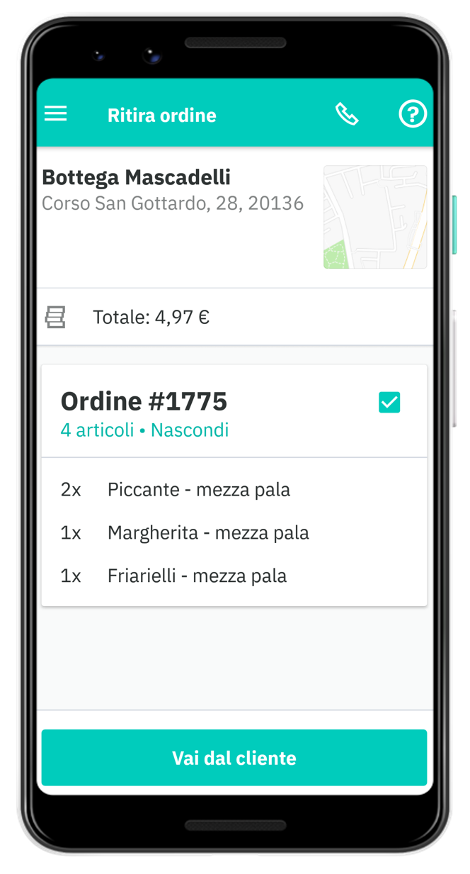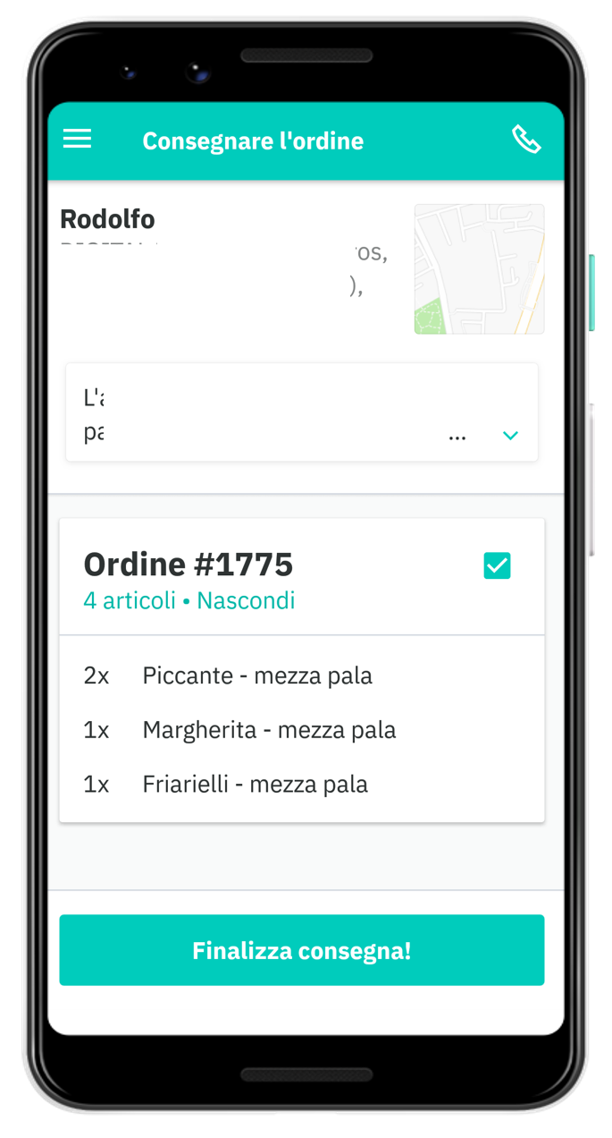 Quando sarai vicino alla tua destinazione clicca prima sul pulsante in basso per visualizzare i dettagli della tua consegna, successivamente spunta la casella del tuo ordine e infine il tasto "Finalizza la consegna". Ed è fatta!